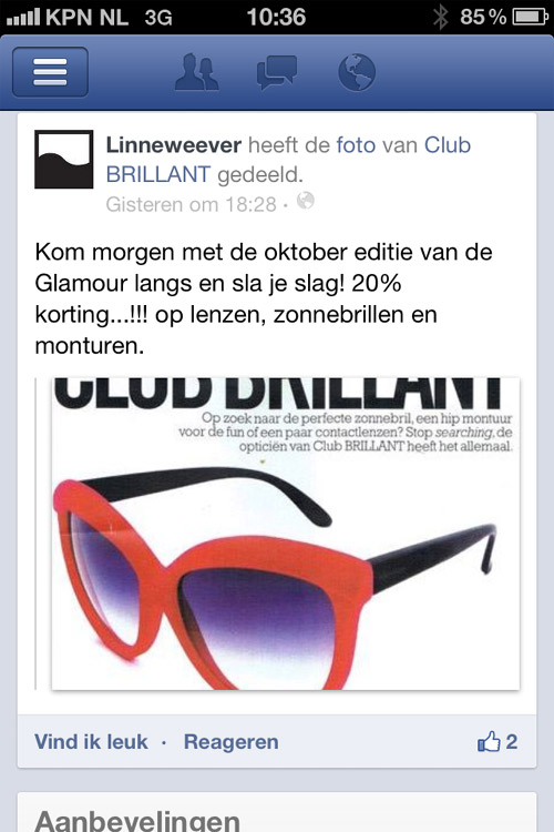 Last Saturday was National Glamour Day in the Netherlands and the Dutch Club BRILLANT opticians once again joined this promotion organized by the well-known magazine, together with another 3.000 stores all over the country. Next to the advertising page in Glamour magazine itself and a link from the Glamour website to the Club BRILLANT website, the Club BRILLANT members could also be found through the National Glamour Day app which everyone could easily download in the App store. With only one click you could find a map of the country with all the Club BRILLANT opticians and one click more gave you more information about their location, opening hours etc.. With banners in shopwindows as well as displaycards instore and Facebook messages, Club BRILLANT opticians created local awareness. Quite a good promotion fitting perfectly into all new developments at Club BRILLANT. As from next month the unique cooperation between the coolest brands and the best stores launches a new webplatform where all of them can easily be found. Very recognizable and striking advertisements as well as an intensive PR campaign will draw attention to both brands, stores and the platform itself. Club BRILLANT 2.0 is ready for the future and all these interesting developments mark a new and important step forward in the process of distinguishing the best optical stores from all their competitors!